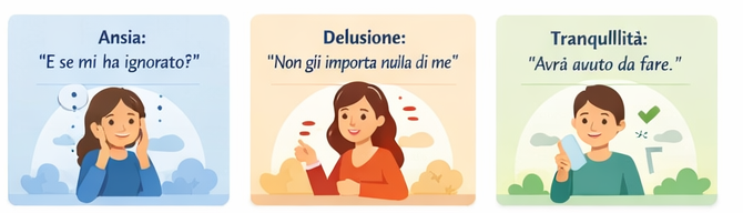 - Possiamo invece pensare: “Mi sta ignorando” o “Ho fatto qualcosa di sbagliato”, provare ansia o tristezza e iniziare a rimuginare o a controllare continuamente il telefono.