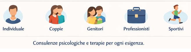 Singoli, coppie, genitori, professionisti o sportivi possono beneficiare di consulenze psicologiche, percorsi di psicoterapia individuale, terapia di coppia o supporto per gestione dello stress e ansia.